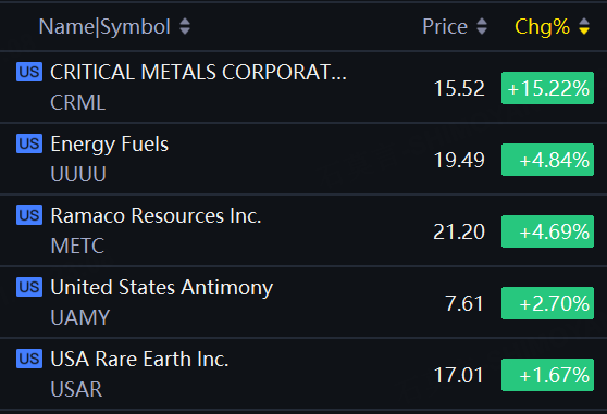 Rare earth stocks rallied on Friday. Critical Metals up over 15%; Energy Fuels up about 5%; Ramaco Resources up over 4%; UAMY, USAR up about 2%.