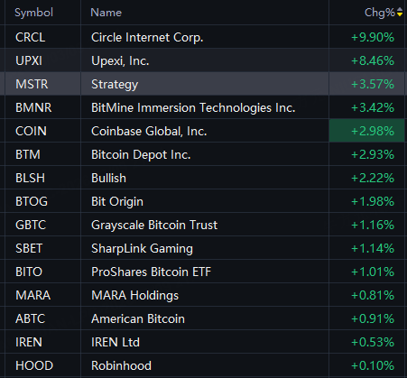 Circle up 10%; Upexi up 8%; Strategy up 4%; BMNR, Coinbase up 3%.