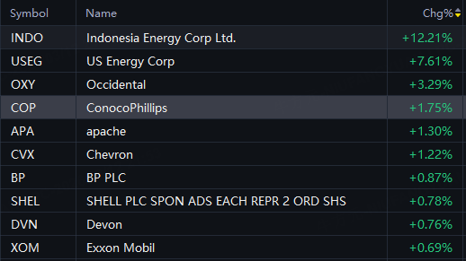 Indonesia Energy up 12%; US Energy up 8%; Occidental up 3%; ConocoPhillips up 2%.