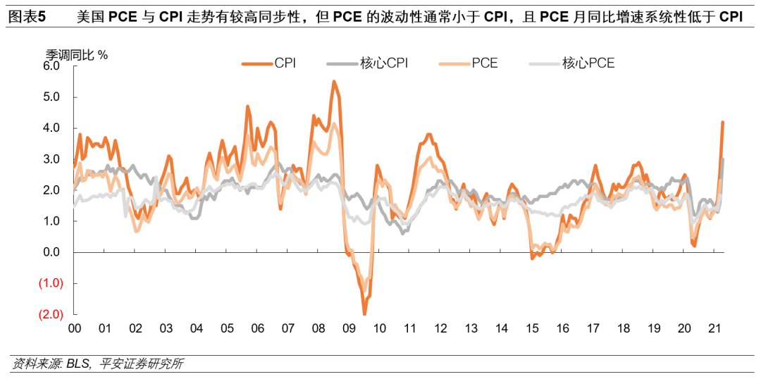3)指标走势上看,历史上PCE与CPI走势有较高同步性,但PCE的波动性通常小于CPI,且PCE月同比增速系统性低于CPI。我们测算,2000年1月至2021年3月期间,美国PCE与CPI(月同比增速,下同)相关系数为0.983,核心PCE与核心CPI的相关系数为0.966;PCE月同比波动率为0.93%,CPI波动率为1.23%;PCE月同比平均值为1.81%,CPI平均值为2.12%。