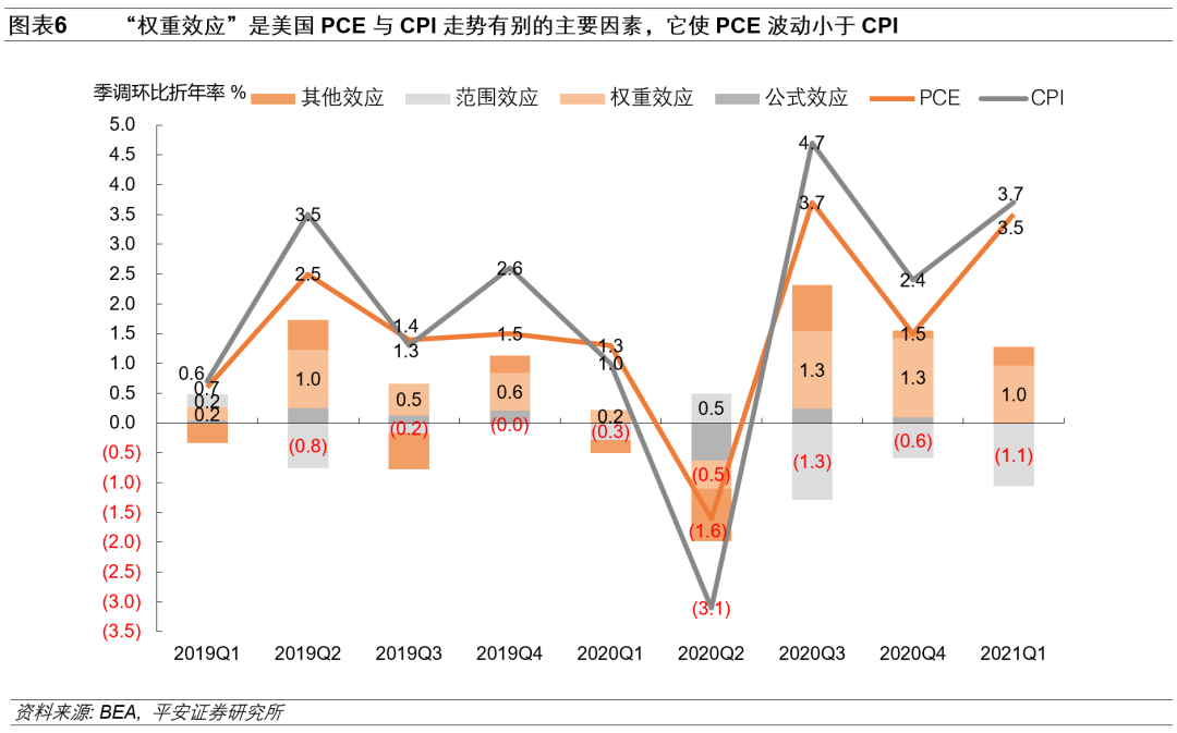 2)权重效应,即两个“篮子”中相同商品被赋予不同权重。CPI的权重使用的是居民购买情况调查里的权重,而PCE用的是企业销售产品情况调查的权重。例如,住房在美国PCE中的权重要显著小于CPI,2021Q1因住房权重不同PCE季调环比折年率比CPI低0.31个百分点。