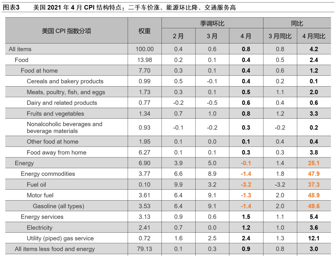 综合来看,4月CPI数据体现的是,美国经济重启时出现了“暂时性”的需求激增,体现为食品饮料和交通出行的需求更快上升。随着美国疫情控制、线下消费与出行场景恢复,与之相关的需求增长带动物价短线上升是可以理解的。