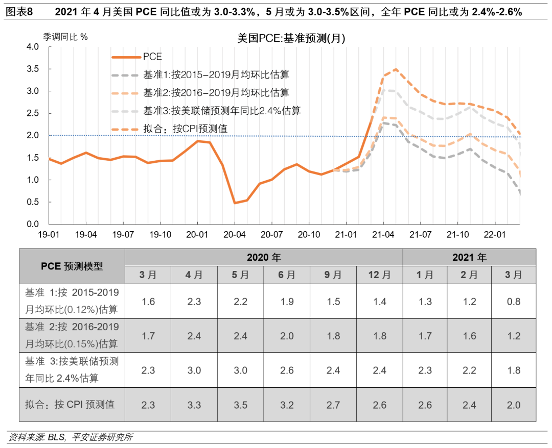 综合考虑基数效应以及CPI与PCE的相关性,我们预测,2021年4月PCE同比值在3.0-3.3%区间,5月PCE同比在3.0-3.5%区间(或为全年高点),2021年PCE同比值为2.4-2.6%区间(略高于3月美联储预测中值的2.4%),2022年一季度PCE同比增速有望回落至2%附近或以下。