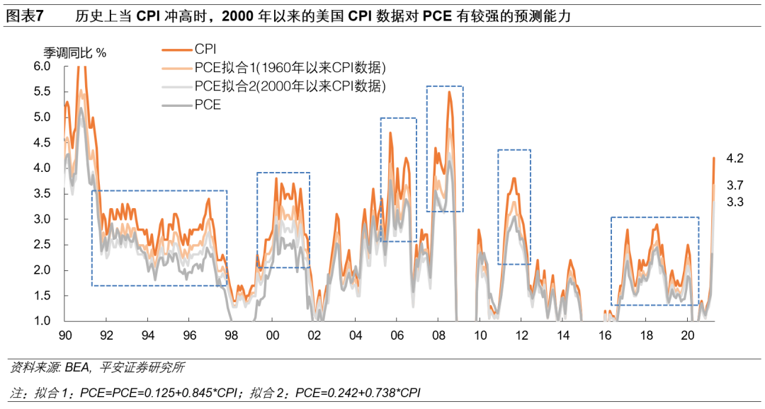 我们发现,以2000年以来CPI数据进行的PCE拟合值与实际值更为贴合。尤其在CPI同比增速冲高的时期,通常可以观察到,CPI实际增速>PCE拟合1>PCE拟合2>=PCE实际增速(图表7)。根据4月美国CPI月同比(4.2%),两个模型的4月PCE拟合值分别为3.7%和3.3%。
