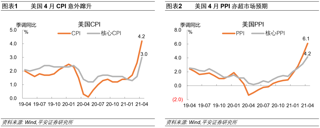 美国4月CPI 同比4.2%,为2008年9月以来最高增速;环比0.8%,市场预期为0.2%。4月核心CPI同比3.0%;环比0.9%,市场预期为0.3%。整体看,4月美国CPI以及核心CPI增速都大幅超过市场预期。
