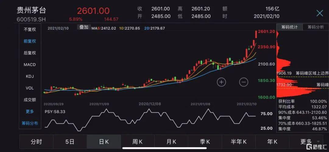 2月10日,中信证券发布研报,给予贵州茅台3000元的目标价,同日安信证券的研报也给出了2710元的目标价。贵州茅台的最新收盘价为2601元,若按照3000元的目标价算,还有约15%的预期上涨空间。