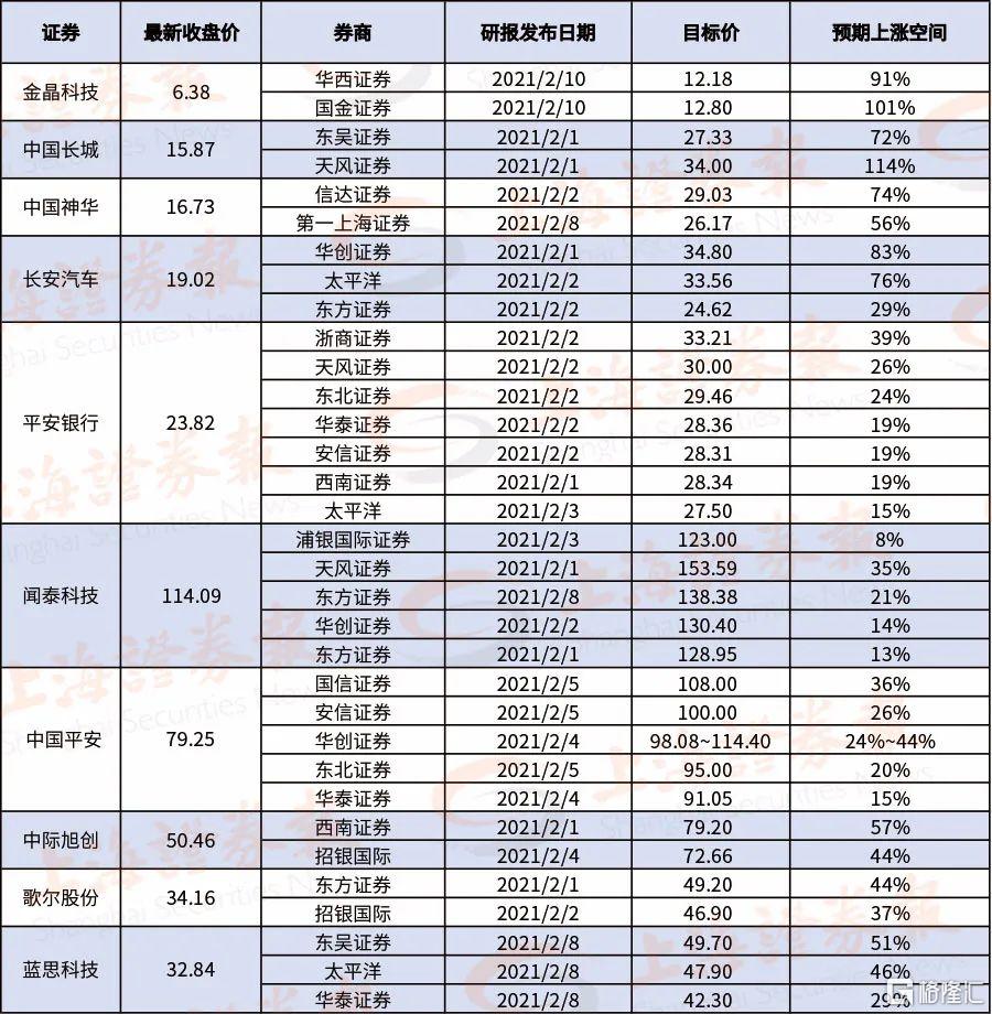 小编梳理发现,一些股票被多个券商给出高目标价。比如金晶科技2月以来被华西证券与国金证券给出较高目标价,尚有翻倍的空间;中国长城分别被天风证券、东吴证券推荐;长安汽车被华创证券、太平洋证券、东方证券等券商推荐。