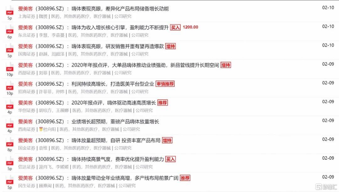 “女人的茅台”爱美客近期也被诸多券商出具研报看好,其中东北证券于10日给出了1200元的目标价。不过爱美客2月10日收盘价格为1215元,已经突破了券商给出的目标价。