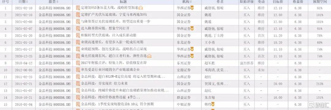 比如,金晶科技近期突然被华西证券、国金证券、东北证券等券商出具研报,并且均给出了12元以上的目标价,相比其当前股价(6.38元)有望翻倍。回顾过去,金晶科技近几年在卖方的关注寥寥,除了东兴证券曾在2018年点评其2017年报以外,其上一次引起券商大规模关注尚在2011年。