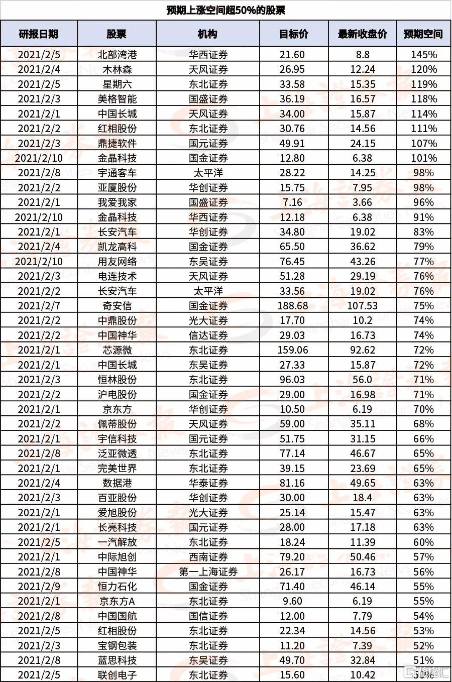 从券商最新研报来看,2月以来券商发布了近1000份评级为“买入”或“强推”的研报,其中43只股票的预期上涨空间超过50%,8只有望翻倍。
