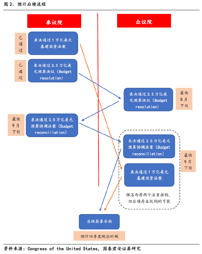 美国8月10日和11日,参议院分别表决通过了1万亿美元基建投资法案和约3.5万亿美元预算决议,本报告将主要探究两个法案后续还将经历哪些流程,以及最终落地的可能性和时点。