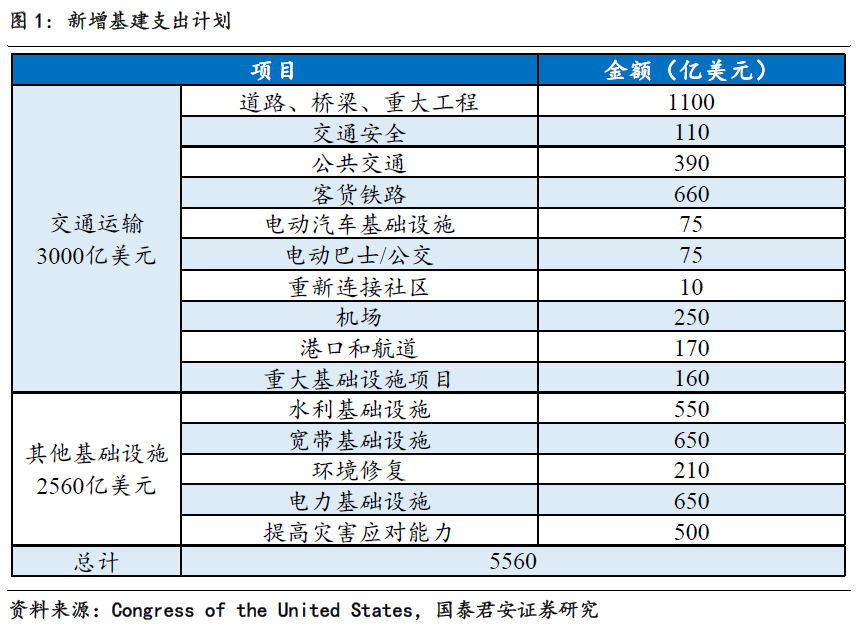1万亿美元基建投资法案主要继承自拜登此前提出的约2.3万亿美元的“美国就业计划”,但与最初版本的“美国就业计划”相比,本次基建投资法案剔除了“人文关怀”的部分,仅保留了对传统基建投资的内容,同时规模也有不同程度的缩减。本次通过基建投资法案中大约有5500亿美元为新增基建投资,其中约3000亿美元投资于道路桥梁、客货铁路等与交通运输相关的基建,2500亿美元投资于水利、宽带、电力等其他基建设施。若这些措施最终成为法律,将在未来5年内启动道路桥梁、水利等项目建设,在未来10年内启动其他项目建设。从行业角度来看,将利好基建、新能源汽车、电力、环保等行业。