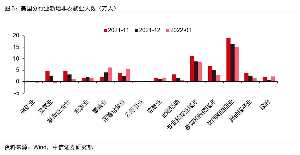 2022年1月美国新增非农就业人数超预期,劳动力参与率显著提升,显示美国就业市场稳步复苏,未明显受到Omicron变异毒株影响。美国1月新增非农就业人数46.7万人,远高于市场预期(-40万人~25万人),同时去年11月和12月新增非农就业人数分别上调至64.7万人和51万人,两月上调累计增长70.9万人。尽管失业率较去年12月的3.9%小幅回升至4.0%,但劳动力参与率显著提升0.3个百分点至62.2%,仅与2020年3月的62.7%相差0.5个百分点。从分项数据看,休闲和酒店业贡献了最大增幅,部分地区进入室内场所需要出示疫苗接种证明的规定或许在一定程度上提升了人们进入休闲酒店业工作的意愿。尽管2021年1月的家庭调查样本较2020年12月发生变化导致直接比较两月的数据可能存在误差,但是就业数据整体超预期的表现依然显示美国就业市场并未明显受到Omicron变异毒株的影响,仍走在稳步修复的道路上。