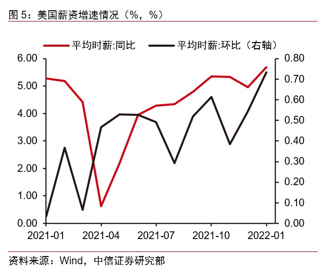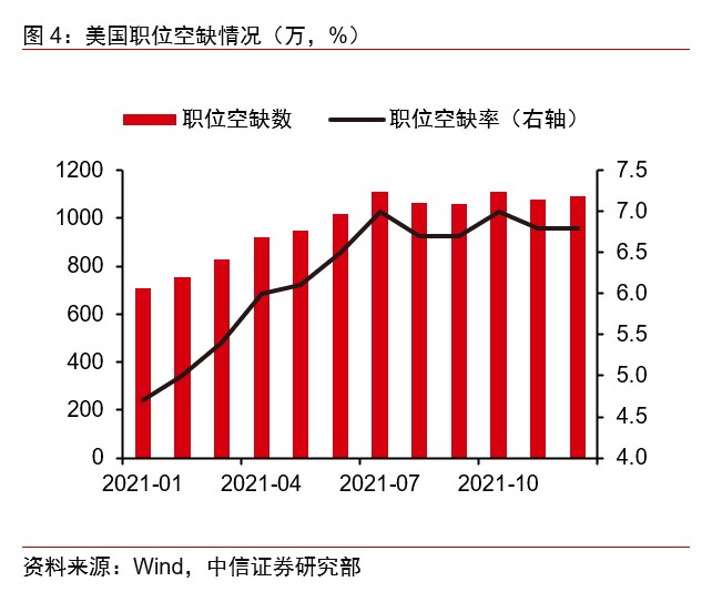 职位空缺数仍高,时薪增速超预期,显示美国就业市场供不应求状态延续,工资-价格螺旋风险继续上升。2021年12月美国职位空缺数达到1092.5万,显著高于预期的1030万,同时11月职位空缺数由1056.2万上修至1077.5万。与职位空缺数高企相伴随的是薪资水平不断快速增长,2022年1月美国非农就业时薪环比和同比增速均超预期,5.7%的同比增速创2020年5月以来的最大增幅。职位空缺数高叠加时薪增速高,显示雇主努力提升工资吸引劳动力,但依然难以改变美国就业市场供不应求的状况。而工资价格的快速上涨也进一步增加了美国出现工资-价格螺旋的风险。