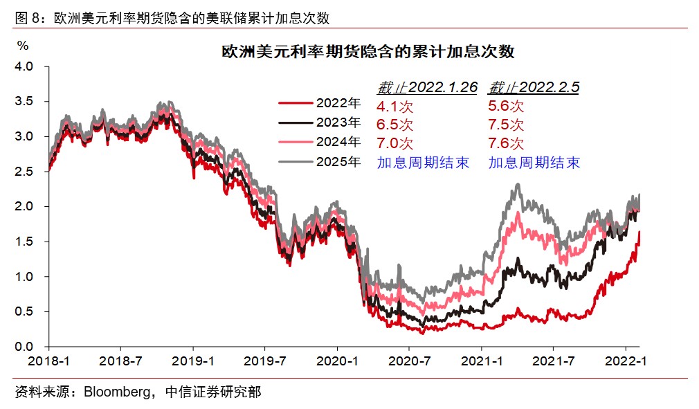 欧洲央行在2月的议息会议上同样释放鹰派信号,其突然的转向完全超出市场预期。由于前一天公布的1月通胀数据创历史新高且远超市场预期,欧洲央行态度发生巨大转变。尽管会议声明总体符合预期,但会后欧洲央行行长拉加德的讲话则一展鹰派风格。首先,拉加德表示欧洲央行管委会一致担忧通胀高企时间长于预期;其次,她不再坚持此前一直强调的“2022年不太可能加息”的论断,表示“情况确实发生了变化”。其论调的突然转向与美联储主席鲍威尔首次表示“是时候放弃‘暂时性’这个词”有异曲同工之意,或预示着欧洲央行货币政策将正式开始转向。不过,即便欧洲央行开始加息,其首次加息的时点也将在停止扩表之后进行。同时,还需进一步关注后续欧元区通胀数据的变化。