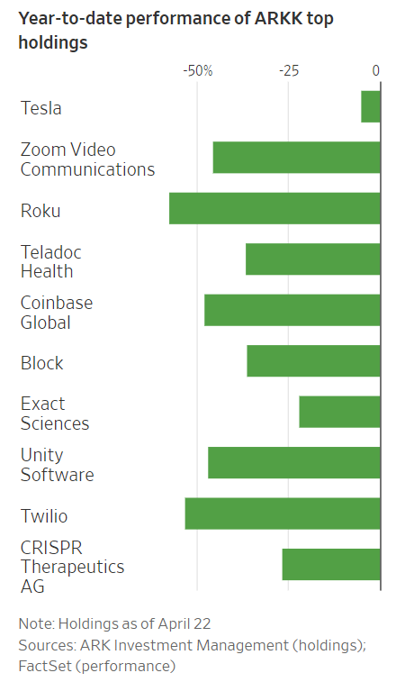 Those are just the type of companies that ARKK targets through its investment theme of "disruptive innovation." Its big holdings include Tesla Inc., Zoom Video Communications Inc., Roku Inc., Teladoc Health Inc. and Coinbase Global Inc. With the exception of Tesla, those stocks have all fallen more than 35% this year.