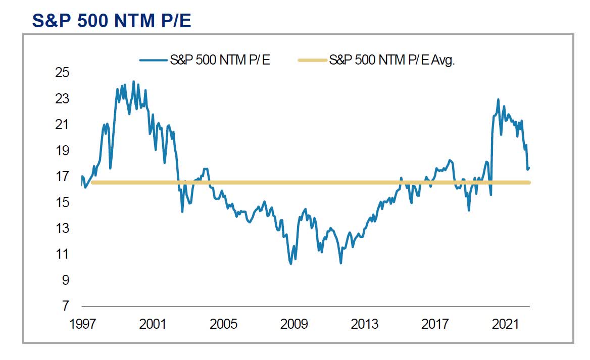 As interest rates rise, that number, for the stock market taken as a whole, will fall. We believe it will fall back towards historical norms; indeed, it already is doing so. Layer in the anticipation of decelerating earnings or a potential recession, and the price contraction is even sharper.