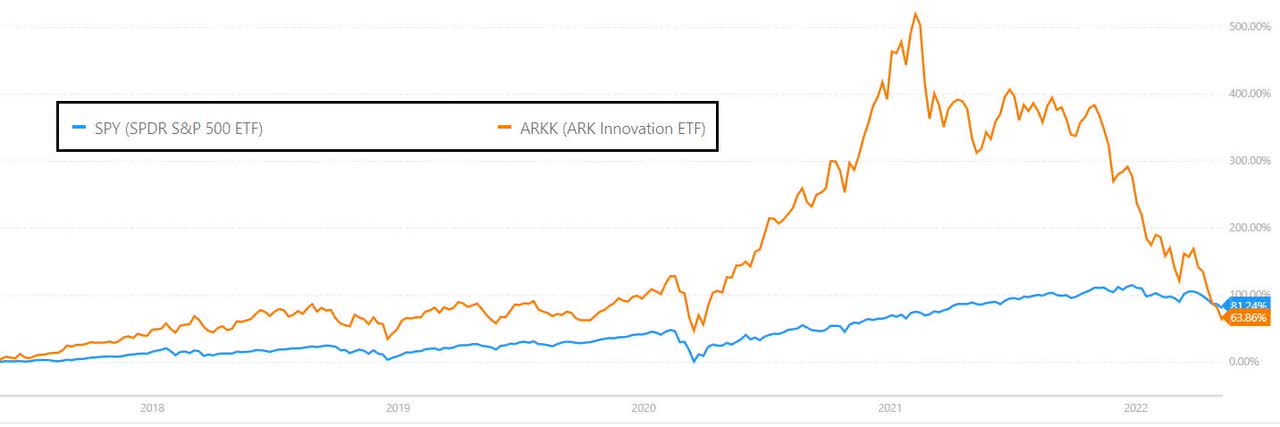 Reversion to the mean is a reality. We mean no disrespect to ARK Invest and its management when we point out that on a five-year basis, the performance of the ARK Innovation Fund (ARKK), a flagship of the most prominent tech innovators and disruptors, has now fallen below the S&P 500.