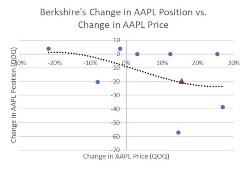 The chart below is a scatter plot that shows the inverse relationship between (1) the change in AAPL share price from quarter to quarter and (2) the change in AAPL shares owned by Berkshire Hathaway. In other words: Berkshire has consistently bought AAPL low, sold high.