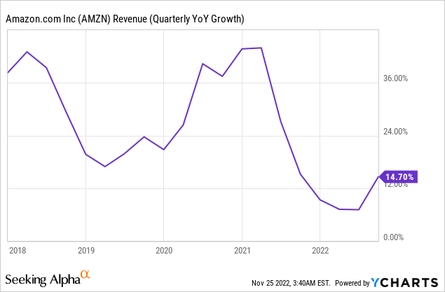 Amazon's Q4'22 outlook calls for $140B to $148B in revenues which implies that the firm's growth rate could slow to just 2% year over year in the fourth-quarter. It is therefore likely that Amazon will post the slowest growth ever as a public company in the near term, which could push shares of the e-Commerce giant into a new down-leg.