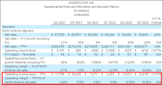 The situation is even worse for the international business, but less severe in total dollar terms because the international segment generates much lower revenues than Amazon's North American segment. The international segment generated $27.7B in Q3'22 revenues which is equal to just 35% of revenues in the North American e-Commerce business. International segment operating losses in the last 12-month period totaled $7.1B and reflected a negative operating margin of 5.9%. Both the international as well as the North American e-Commerce segments were consistently unprofitable in each of the last four quarters and losses in the international business escalated to $2.5B just in Q3'22.