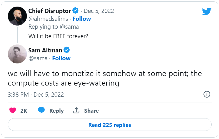 "I don't think OpenAI intended to make a business out of ChatGPT. I think it functions as a demo ... and a way to gather human feedback for free," said Cowen. "Usage grew a lot faster than expected, so they are now contemplating monetization."