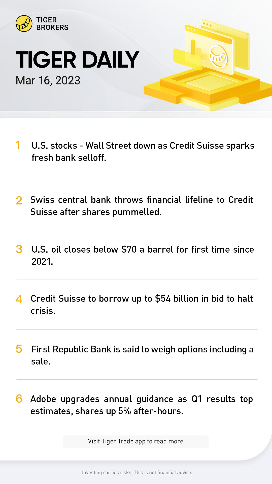 U.S.-listed shares of Credit Suisse hit a record low, after its largest investor said it could not provide more financing to the bank, starting a rout in European lenders and pressuring U.S. banks as well.