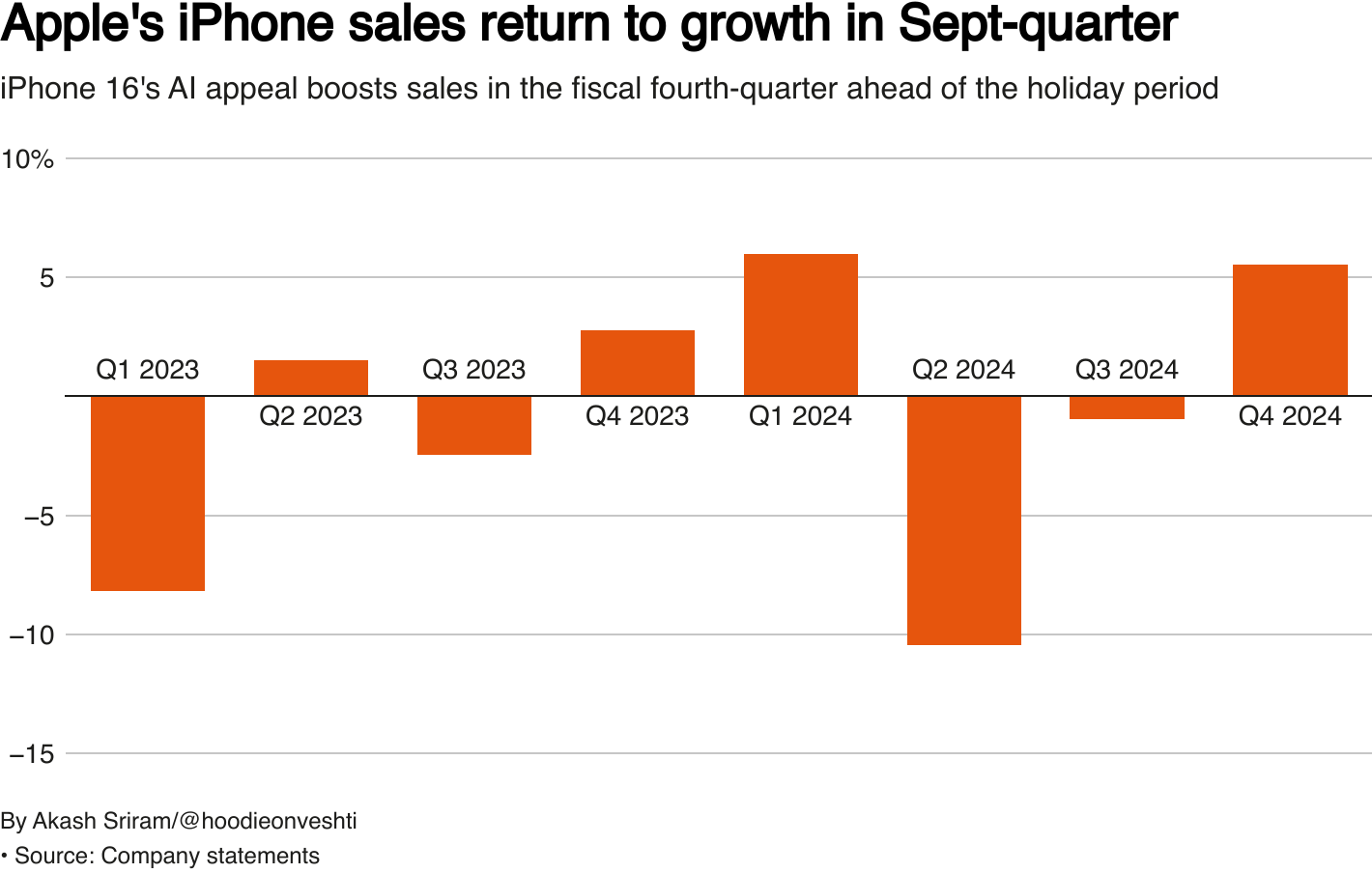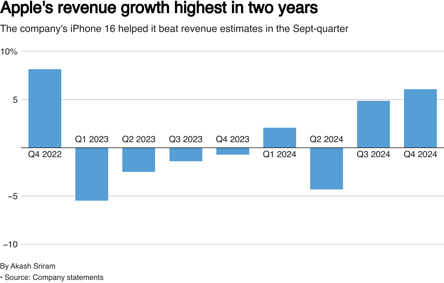 Apple's fourth quarter ended Sept. 28, meaning it reflects only a few days of sales of its iPhone 16 series that went on sale Sept. 20. Apple Chief Executive Tim Cook told Reuters that iPhone 16 sales grew faster than iPhone 15 sales did a year earlier, with both phones on sale for the same number of days in the fourth quarter.