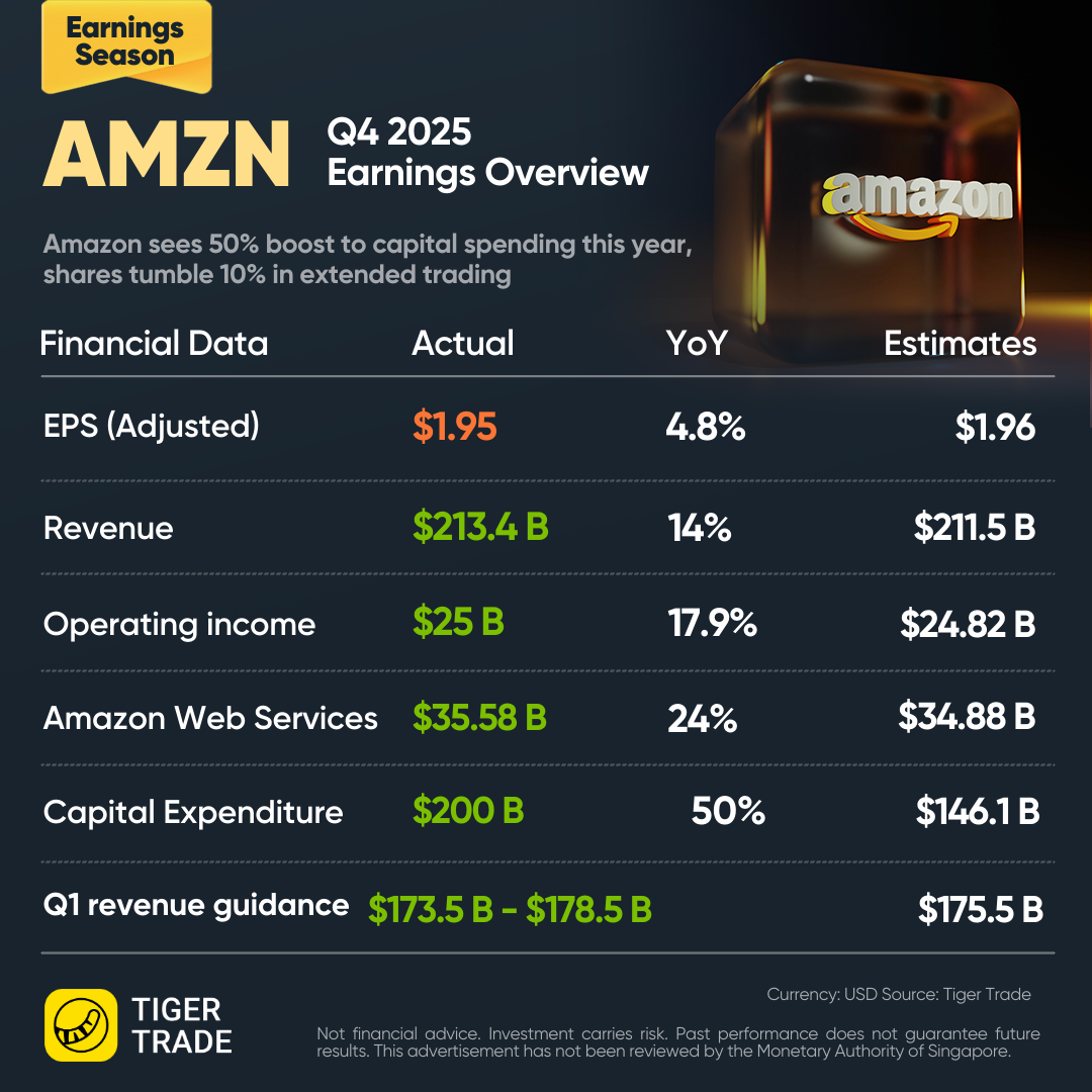 The company said it expects to invest about $200 billion in capital expenditures across Amazon in 2026, compared with about $131 billion in 2025. Amazon's forecast for first-quarter operating income of $16.5 billion to $21.5 billion disappointed, falling below analysts' estimate of $22.04 billion.