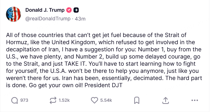 WASHINGTON, March 31 (Reuters) - U.S. President Donald Trump urged countries who did not help the U.S. in its coordinated strikes against Iran and are now unable to get jet fuel to buy American oil and go to the Strait of Hormuz and "just TAKE it."