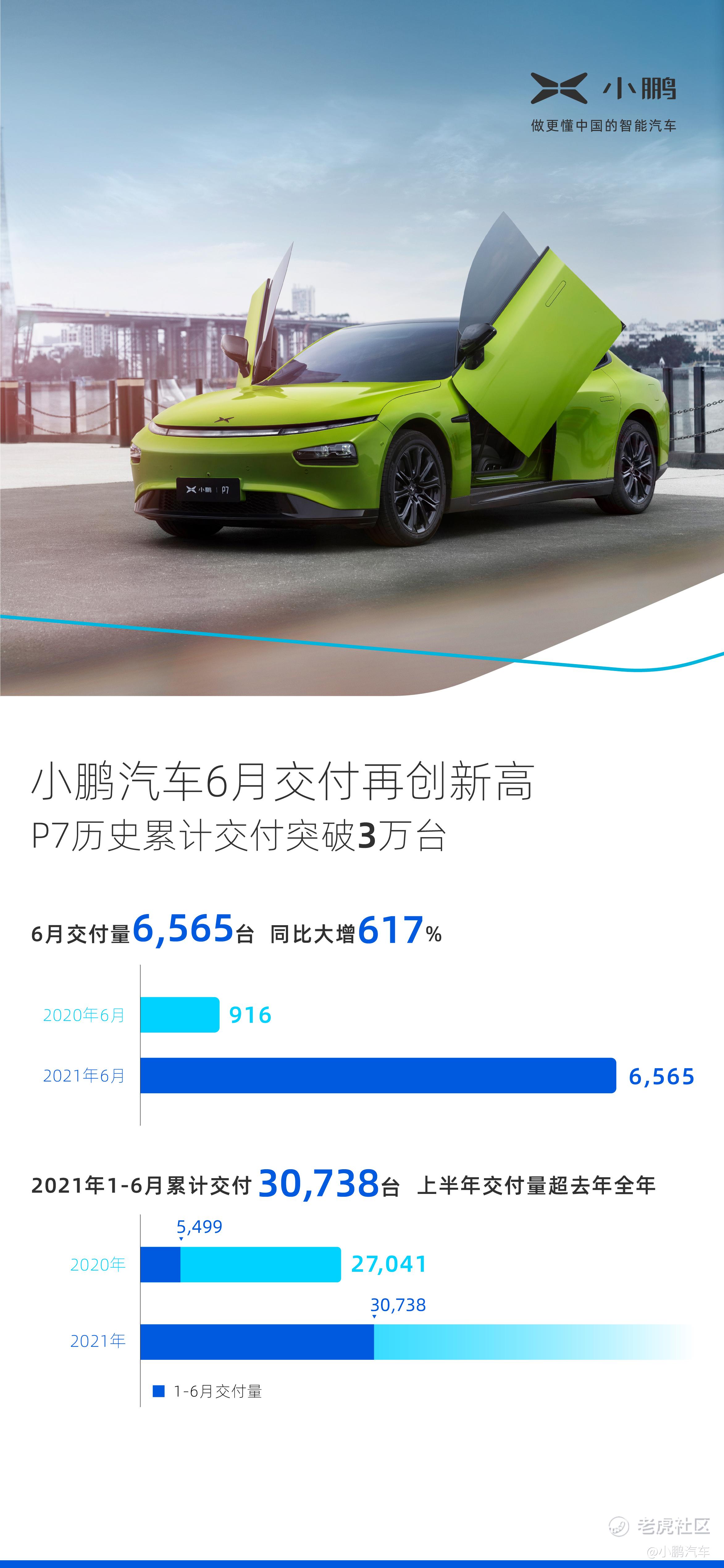 小鵬汽車公佈了2021年6月及上半年交付成績,月度、季度及半年度累計交付量均創歷史新高。其中,6月交付量達6,565臺,較5月的5,686臺環比大增15%,同比增長高達617%。