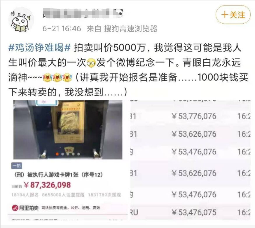 當這張青眼白龍價格超過100萬以後,其實每一個出價的人應該都明白,這東西不值這個價,這東西他們買不起,但他們還是選擇出價了。