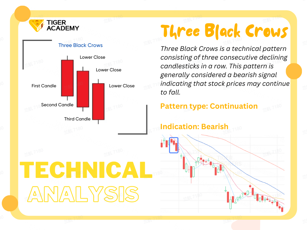 Three Black Crows is a technical pattern consisting of three consecutive declining candlesticks in a row. This pattern is generally considered a bearish signal indicating that stock prices may continue to fall.