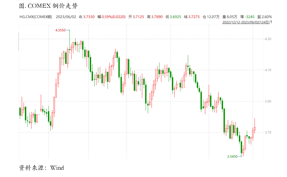 COMEX copper price fluctuated and rebounded last week, and the operating center of gravity moved up. The resolution of the debt ceiling problem has given the market some room to risk on, and risky assets have generally rebounded. The weaker economic data in Europe was priced in the previous price decline, while the economic data in the United States continued to perform well last week, and the recession feared by the market seems to be a long time away. This also gives the market the determination to rebound. On Friday, the number of non-farm payrolls in the United States exceeded expectations again, which made the market's expectations for the follow-up monetary policy change again. However, corresponding to the copper price, it is also worried that the follow-up maintenance of high interest rates and even further rate hike may make the aggregate demand still face a greater test and may cause some risk events again. Therefore, the copper price may rebound, but the height should not be too high.