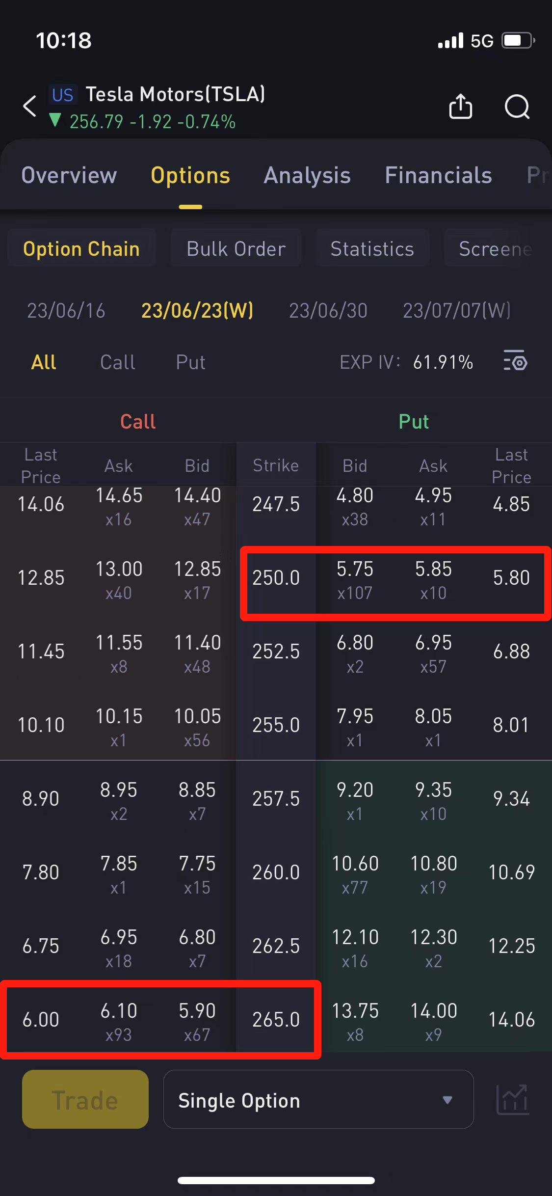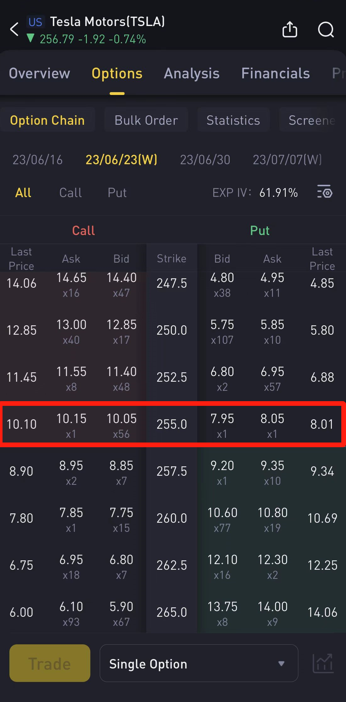For example, let's consider Tesla, which currently has a stock price of around $256. You can choose to sell a call and put option with a strike price of $255, expiring on June 23rd, and collect a combined premium income of $18.11 ($10.10 + $8.01). As long as the stock price fluctuates within the range of $236.89 to $273.11 (255 ± 18.11), this strategy will be profitable.