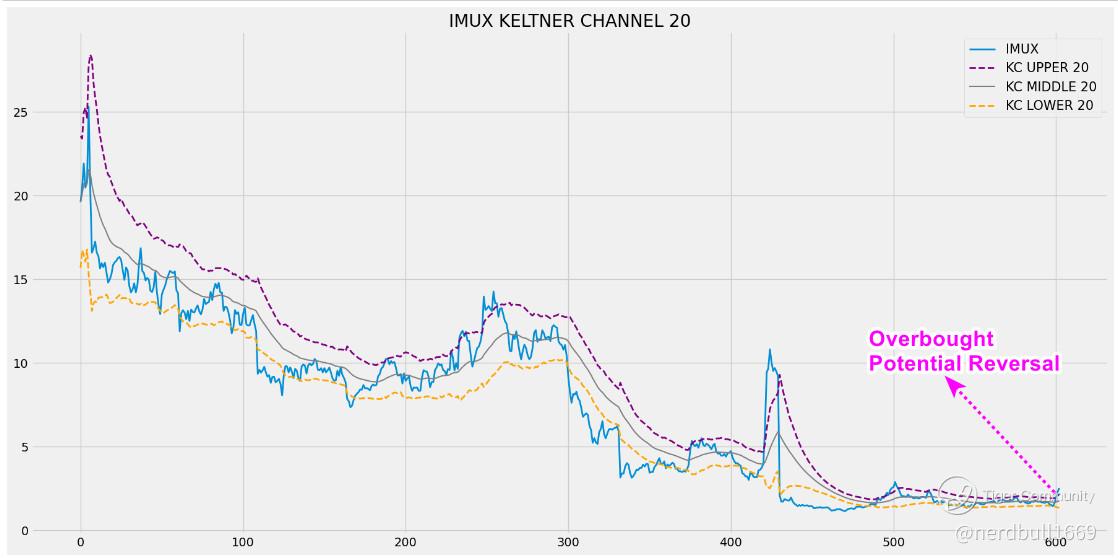 IMUX based on the KC chart, it is currently above the Upper 20, which could indicate an overbought situation.