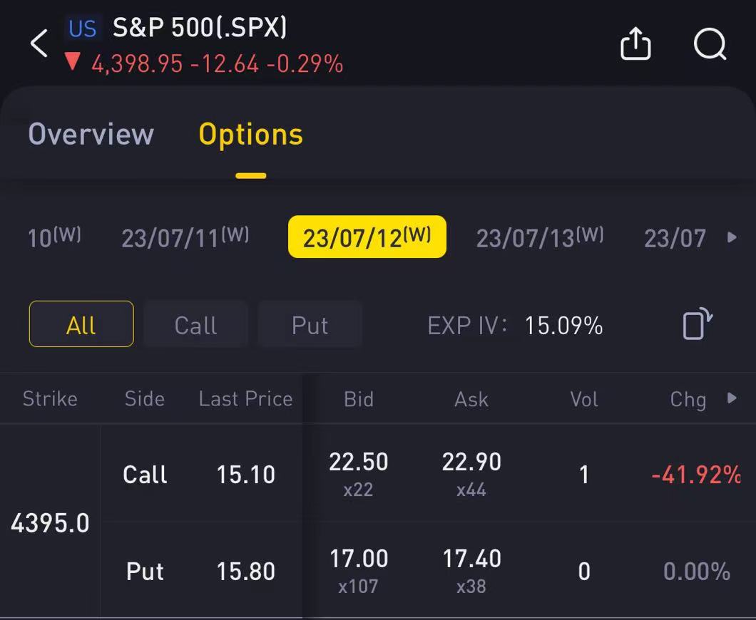 From the price calculation of SPX ATM options expiring on July 12, we know that, based on last Friday's closing price of 4398, the market expects Wednesday's closing price of this week's SPX to rise by 0.42, and fall by 0.48, with the probability of decline slightly greater than that of rise.