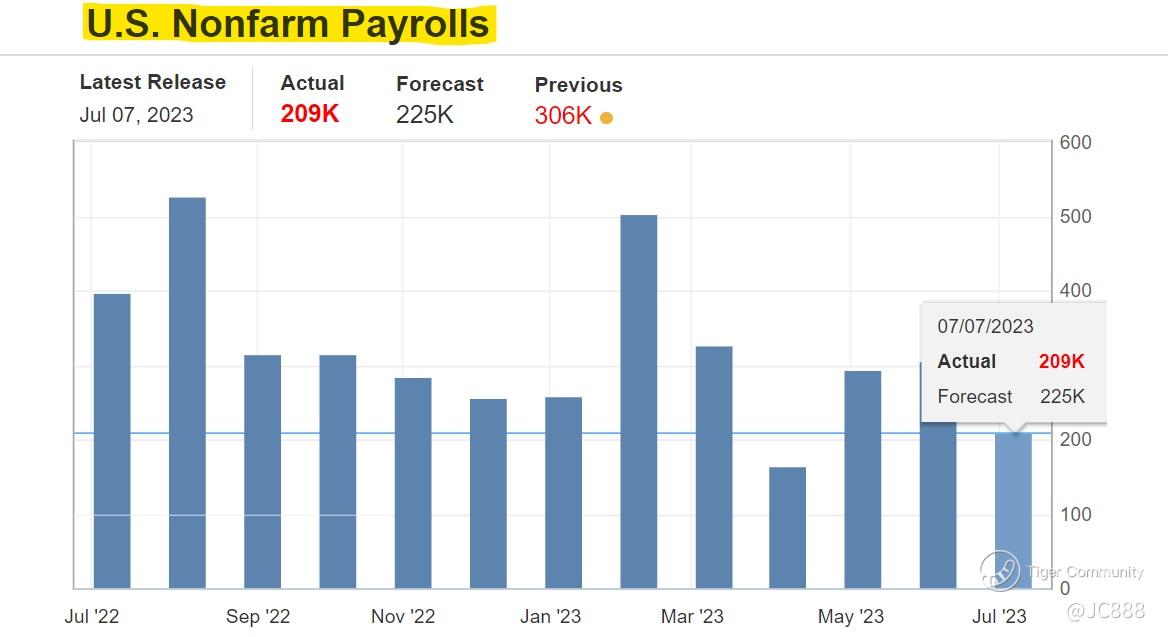 June 2023, NFP showed that US economy created 209,000 jobs (see above).