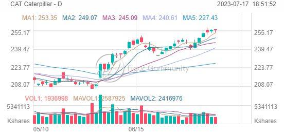 The largest global construction and mining equipment manufacturer $CAT is going to ex_dividend on July 19th with $1.30 as quarterly dividend, an increase from last quarter’s $1.2. For fiscal 2023, three analysts revised their earnings estimate upwards in the last 60 days. $Caterpillar(CAT)$ price at $255.17 with 6.07% YTD in 2023.