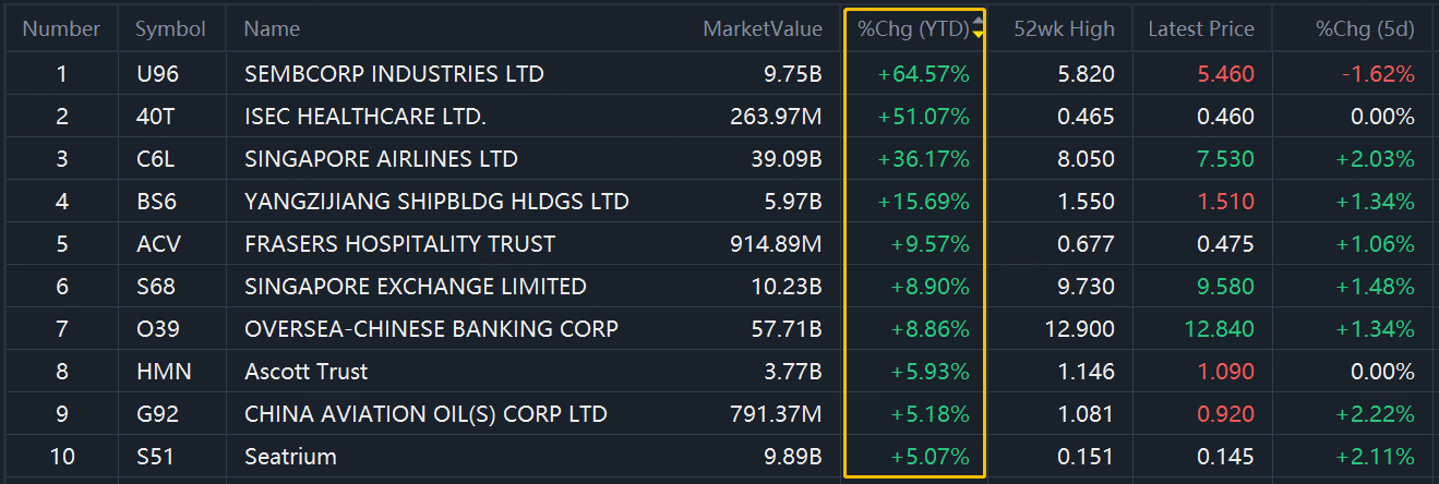 $SEMBCORP INDUSTRIES LTD(U96.SI)$ , $ISEC HEALTHCARE LTD.(40T.SI)$ , $SINGAPORE AIRLINES LTD(C6L.SI)$ , $YANGZIJIANG SHIPBLDG HLDGS LTD(BS6.SI)$ $OVERSEA-CHINESE BANKING CORP(O39.SI)$, $FRASERS HOSPITALITY TRUST(ACV.SI)$ , $OVERSEA-CHINESE BANKING CORP(O39.SI)$ (which ranked top 5 on last week), $SINGAPORE EXCHANGE LIMITED(S68.SI)$ , $Horace Mann Educators(HMN)$ , $CHINA AVIATION OIL(S) CORP LTD(G92.SI)$ , $Seatrium(S51.SI)$ (surpassed $STI ETF(ES3.SI)$ become the Top 10)
