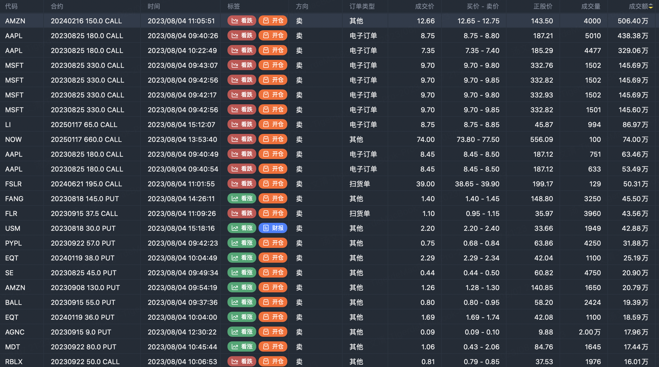 Note: This image data is from Tiger PC. This screen is a significant sell open position for an option contract in the market. A sell of a call option means that the trader believes that the underlying trend has peaked, and a sell of a put option means that the trader believes that the underlying trend has bottomed. These contract openings typically indicate significant activity in the underlying stock, including whether the trader is willing to accumulate a long or short option position.