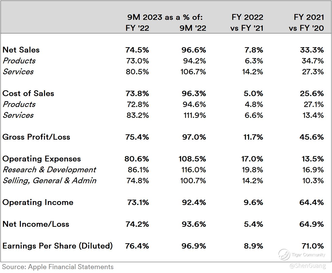 The share of "Services" - comprising Advertising, AppleCare, Cloud Services, Digital Content and Payment Services - has also been growing: from a little under 20% in FY 2020 to over 21% in the past nine months.
