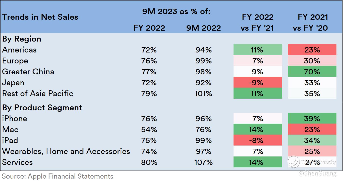 Relative to a corresponding period in 2022 as well as the full FY, there doesn't seem to be a strong surge in demand from any region over the past nine months. For the most part, there seems to be a slight decrease relative to the corresponding period while the comparison relative to the past FY's figures trends towards a "slightly under par" performance for this FY. FY 2021 was a stalwart year wherein sales surged (particularly in China). The following year (FY 2022), while not as massive, was still a net positive growth.