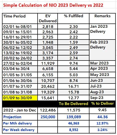 To match 2022 total delivery (122,486 EVs), NIO has 11,575 EVs (or 9.45%) to deliver in the remaining 3 months.