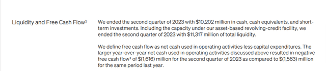 The company reported an increase in negative free cash flow of $1.616 billion in Q2 2023 compared to $1.563 billion in Q2 2022.