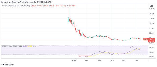 The RIVN weekly RSI chart shows a slow but steady decline since the July 2023 spike and I don't see any reason to catch a failing knife right now.