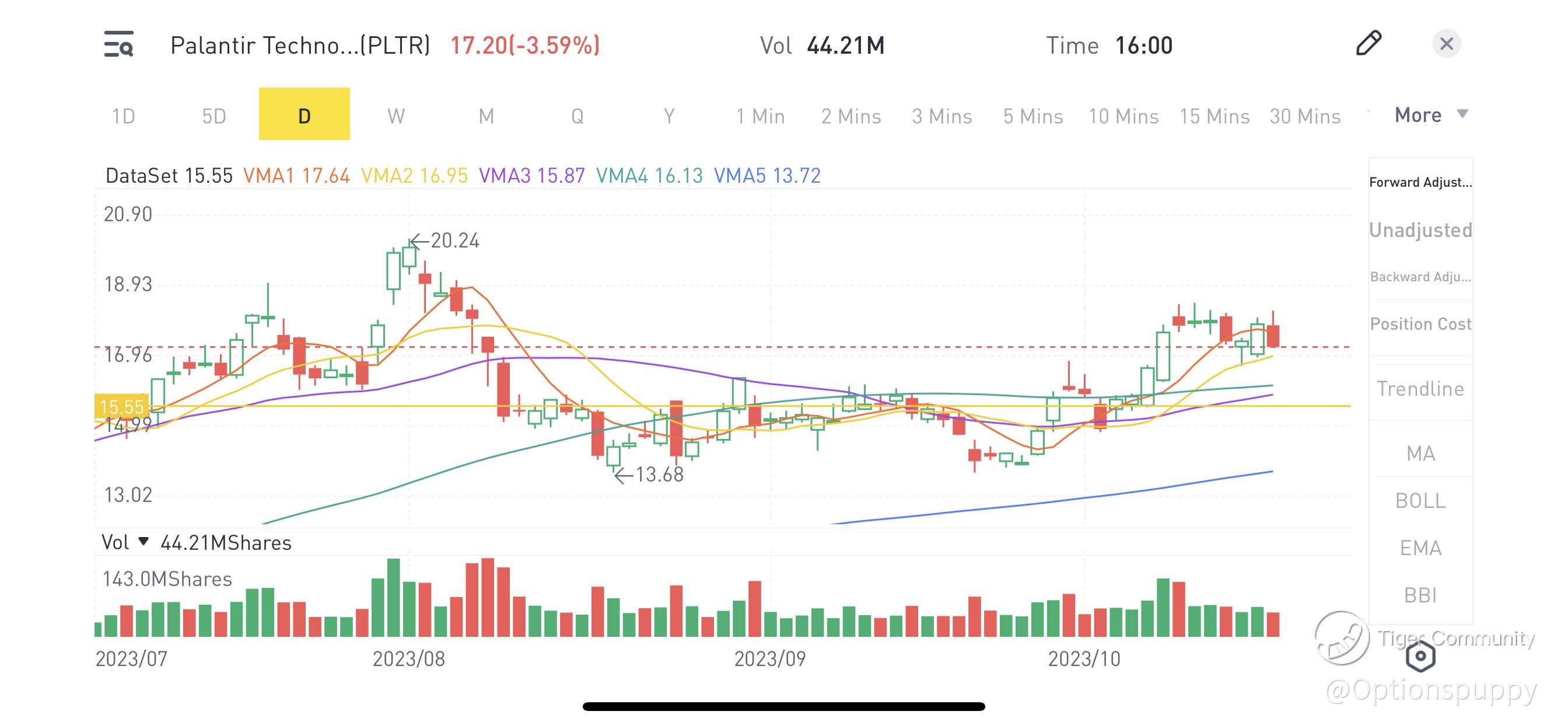 Now, let's talk about the current chart pattern. I've noticed that PLTR has been displaying a Doji pattern for the past 4 days. A Doji suggests market indecision and can be a sign of a potential reversal. Keep a close eye on this pattern – it could lead to exciting opportunities in the near future.