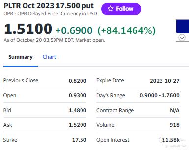 That means PLTR stock has to decline by 0.74% from 20 Oct(Friday)'s price of $16.11 before owners of the puts begin to make money.
