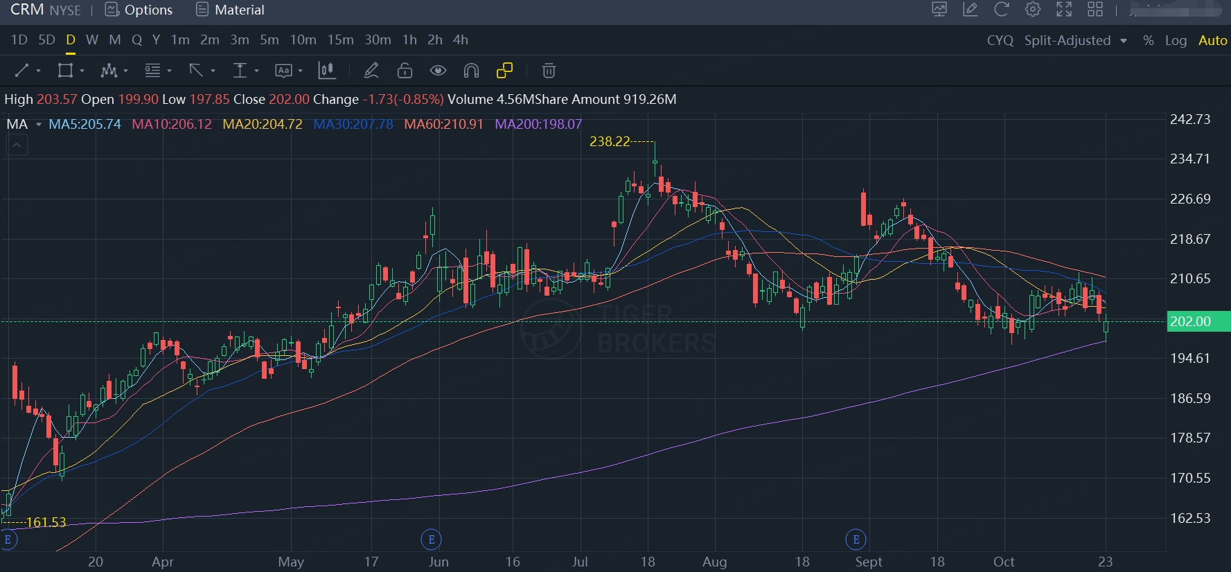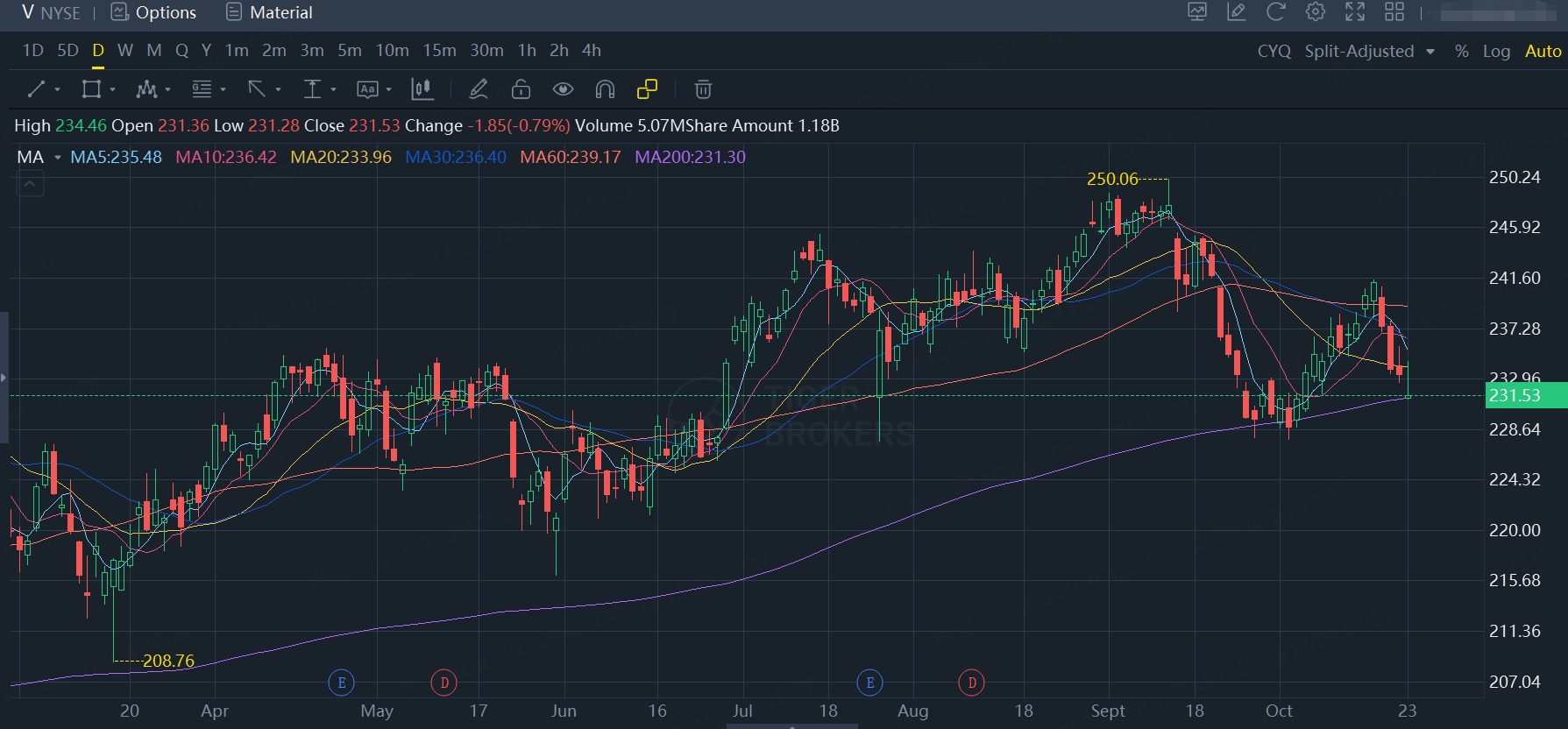 $Visa(V)$ closed at $231.54, right above the 200DMA price at 231.30. $Visa(V)$ will report earnings on Tuesday post market , it is rising in pre-market trading.