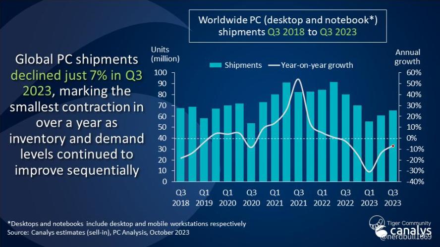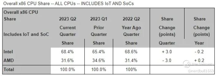Though there is only a 7% decline in global PC shipments in Q3 2023, which is the smallest contraction. AMD market share compared to Intel is significantly lower in Overall x86 CPU share.